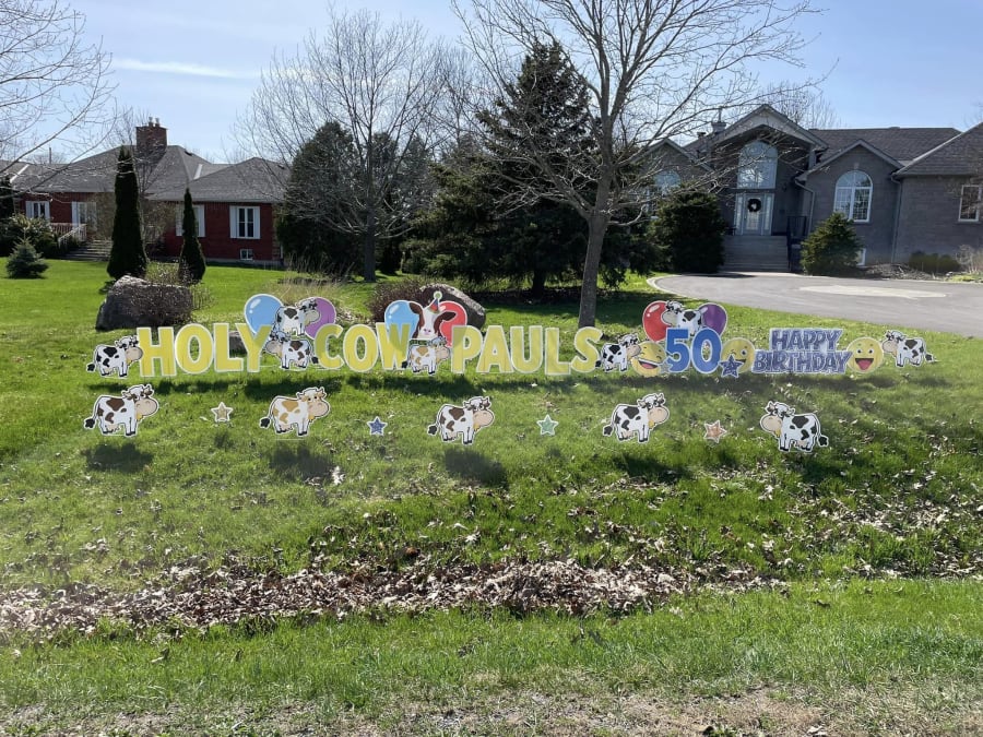 Birthdays are very important occasions to celebrate! Let people know how important they are to their friends, neighbours and family members. A bright, colourful sign lets people know how much they mean to everyone around them. LAWN CARDS are a fun way to share the news and create great memories. CARD YOUR YARD specializes in surprising people on their special day Fun signs with great themes that add a personal touch. We deliver to The Greater Belleville/Quinte and Kingston region (Delivery fee apply based on your area)- select your area from Drop-down Menu in the "BOOK ONLINE" box. Contact us at cardyouryard.ca@gmail.com or call us at 613-402-5867 or 613-885-9790 HOLY COW YOUR 50 HAPPY BIRTHDAY - Includes Age, Balloons, Cows, Emojis Add a name or word $25 Setup EVENING PRIOR between 4-9pm (unless otherwise arranged) Pickup Date Booked after 6pm