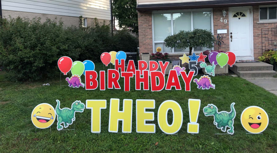 DINOSAUR THEME -HAPPY BIRTHDAY - Includes, Age, Balloons, Dinosaur Theme, Smiley Emojis Add a name or word $25 Setup EVENING PRIOR between 4-9pm (unless otherwise arranged) Pickup Date Booked after 6pm