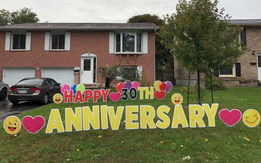 Includes HAPPY ANNIVERSARY with year, balloon cards, hearts, champagne glasses and emojis $125 plus tax