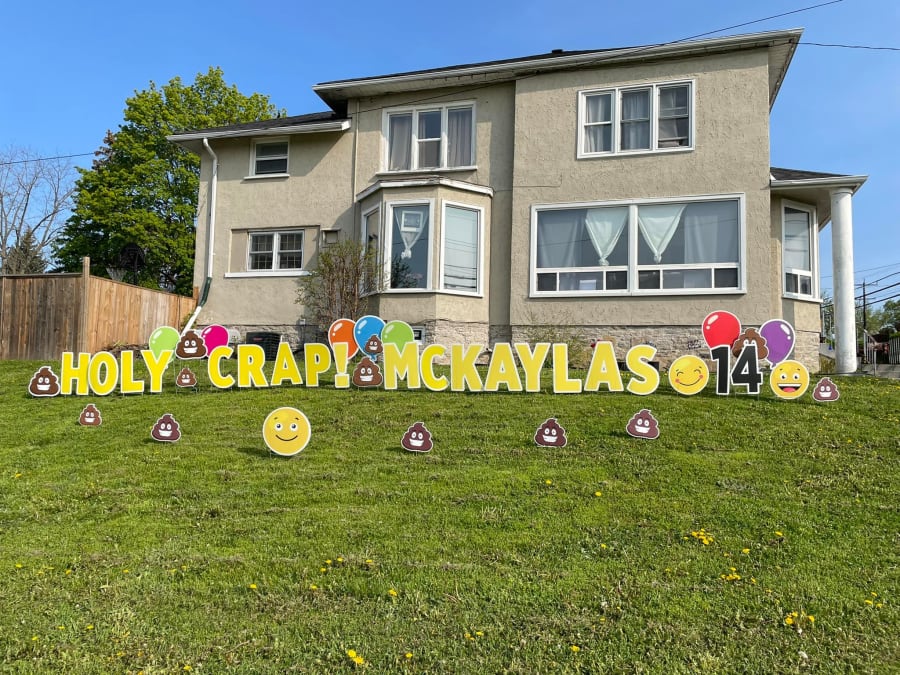 Birthdays are very important occasions to celebrate! Let people know how important they are to their friends, neighbours and family members. A bright, colourful sign lets people know how much they mean to everyone around them. LAWN CARDS are a fun way to share the news and create great memories. CARD YOUR YARD specializes in surprising people on their special day Fun signs with great themes that add a personal touch. We deliver to The Greater Belleville/Quinte and Kingston region (Delivery fee apply based on your area)- select your area from Drop-down Menu in the "BOOK ONLINE" box. Contact us at cardyouryard.ca@gmail.com or call us at 613-402-5867 or 613-885-9790 HOLY CRAP THEME -HOLY CRAP 40! - Includes Age, Balloons, Poop Emojis, Smiley Emojis Add a name or word $25