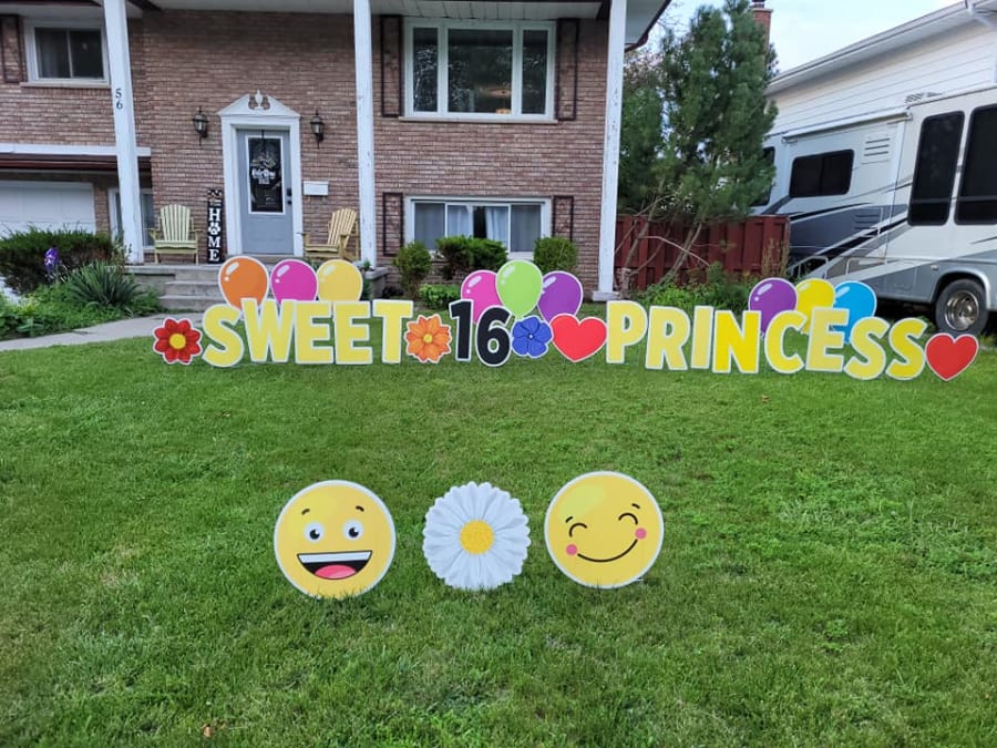 Birthdays are very important occasions to celebrate! Let people know how important they are to their friends, neighbours and family members. A bright, colourful sign lets people know how much they mean to everyone around them. LAWN CARDS are a fun way to share the news and create great memories. CARD YOUR YARD specializes in surprising people on their special day Fun signs with great themes that add a personal touch. We deliver to The Greater Belleville/Quinte and Kingston region (Delivery fee apply based on your area)- select your area from Drop-down Menu in the "BOOK ONLINE" box. Contact us at cardyouryard.ca@gmail.com or call us at 613-402-5867 or 613-885-9790 SWEET 16 - includes balloons, hearts, flowers and a name or word - additional name or word $25