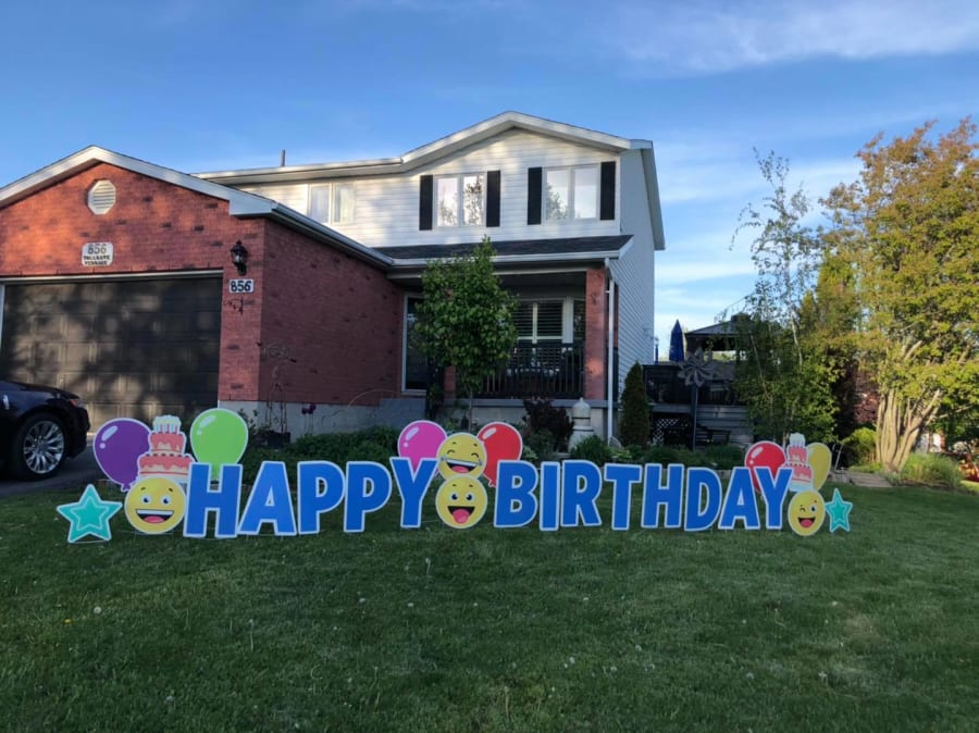 HAPPY BIRTHDAY(blue) - Includes Age, Balloons, Stars and Smiley Emojis( you can request specific theme cards if available) Add a name or word $25 Setup EVENING PRIOR between 4-9pm (unless otherwise arranged) Pickup Date Booked after 6pm