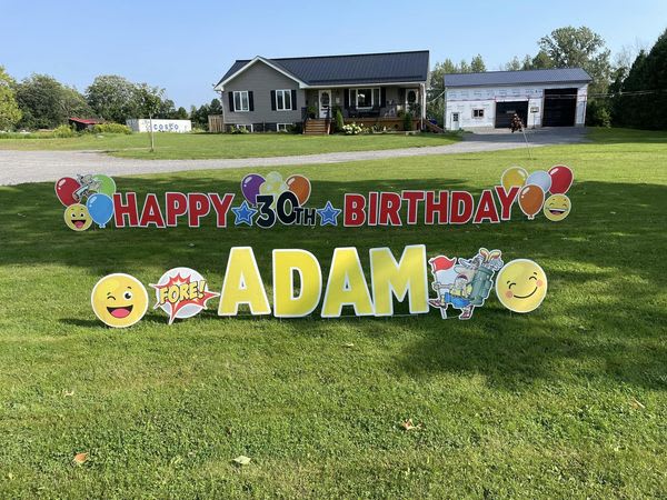 HAPPY BIRHTDAY(Red) - Includes Age, Balloons, Stars and Smiley Emojis( you can request specific theme cards if available)Add a name or word $25 Setup EVENING PRIOR between 4-9pm (unless otherwise arranged) Pickup Date Booked after 6pm