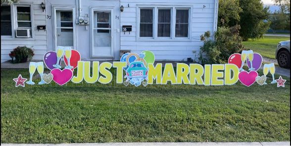 CARD YOUR YARD specializes in surprising people. Fun signs with great themes that add a personal touch. Contact Card Your Yard with any questions. Call us today at: 613-876-6724 or 613-885-9790 JUST MARRIED - Names are additional $25 -Includes Wedding Theme