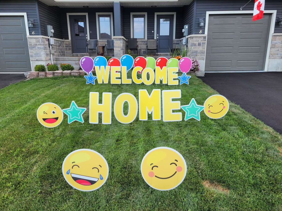 CARD YOUR YARD specializes in surprising people. Fun signs with great themes that add a personal touch. Contact Card Your Yard with any questions. Call us today at: 613-876-6724 or 613-885-9790 WELCOME HOME -includes Balloons, Hearts, Stars, Smiley Emojis (Other Theme cards available on request based on availibility) add a name for additional $25